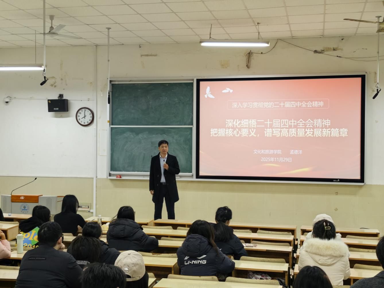 2025年11月29日,永利3044官网党委书记孟德洋在学院多媒体教室开展了党的二十届四中全会精神宣讲活动,以《深化细悟二十届四中全会精神,把握核心要义,谱写高质量发展新篇章》为题做宣讲报告。