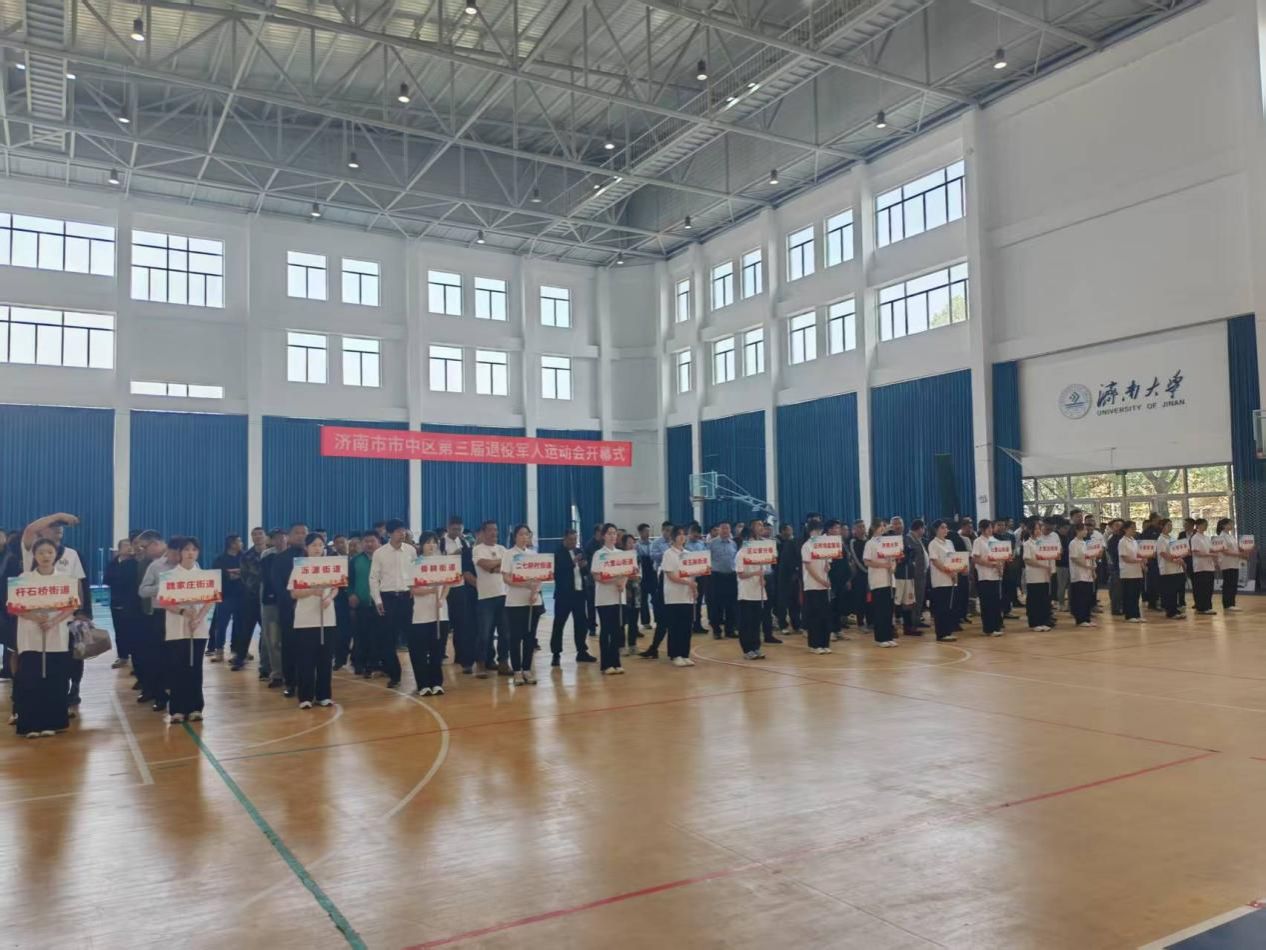 4月28日,由济南市市中区退役军人事务局主办的第三届退役军人运动会暨篮球比赛在3044am永利官网舜耕校区体育馆开幕,各街道均派出代表队参与本次开幕式。志愿者手持街道标识牌,引导各队列入场站位。在开幕式中,退役军人们观看了3044am永利官网风暴军团和翼虎军团的社员带来的擒敌拳和倒功表演。一位退役老兵感叹道:“这些孩子动作里的精气神,有我们当年的劲头。”参与本次开幕式的志愿者黄艺琛在采访时说道:“通过参与本次志愿服务活动,我直观的认识到‘退役不褪色’绝非一句空洞的口号,而是每一位退役军人内心深处的铮铮誓言,在以后的学习生活当中,我要严格规范自己的言行,用实际行动向他们看齐。”