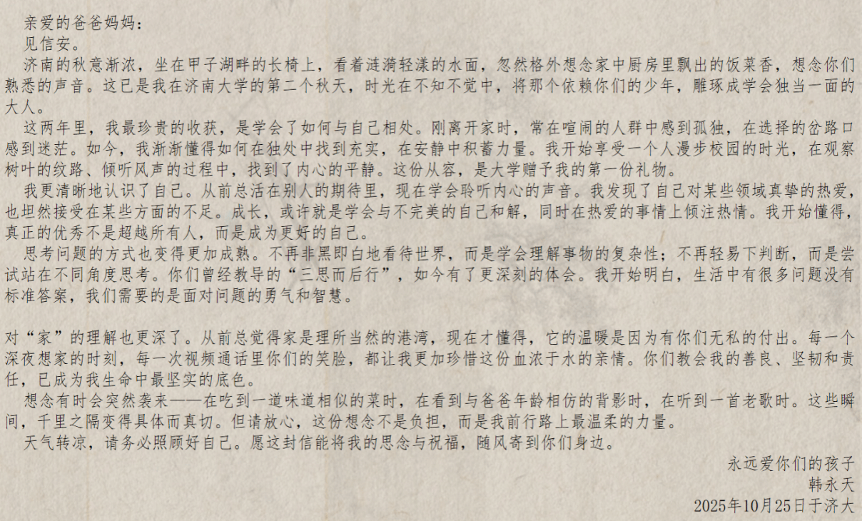 为弘扬尊老敬老的中华优秀传统美德,引导学生关注家庭情感与代际沟通,永利3044官网心理服务协会于2025年10月24日至10月31日面向全院学生成功开展了“九九话重阳,青春绘新意”重阳专属语线上征集活动。活动以重阳节文化内涵为核心,鼓励学生通过现代诗文、家书、创意表情包等形式,向长辈表达感恩之情,传递青春视角下的传统文化新意,受到同学们的广泛关注和积极参与。