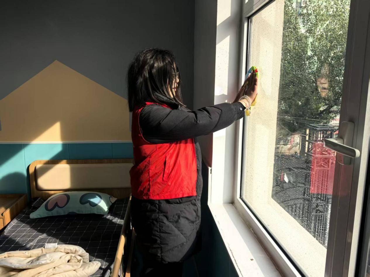 公共设施的清洁聚焦高频接触部位,志愿者们手持消毒湿巾,逐一擦拭活动室门把手、窗台、储物柜拉手及玩具架边缘。面对频繁触碰的门把手,反复擦拭确保消毒彻底;遇上窗台上的顽固污渍,便用温水浸湿抹布耐心清理,让每一处设施都洁净光亮,为孩子们筑牢健康防线。