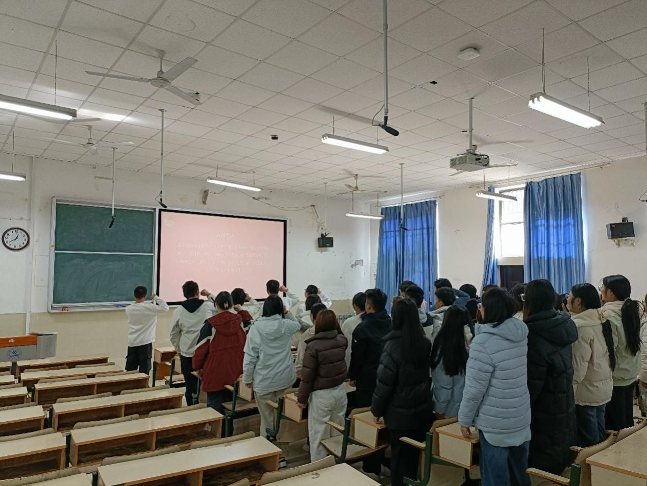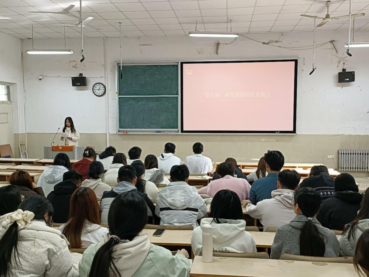 随后,学院团委书记赵军讲话。他指出,经济领域有“先富带动后富”,思想领域则需“先进引领后进”,团员正是凝聚青年思想的先进力量——从当年穿着破旧衣物研发战机的罗阳,到如今攻关航天、军工领域的青年团队,国家发展始终需要有理想的青年作为中流砥柱。他强调,入团不是小事,而是选择了指导思想与政治立场,“思想”这颗种子会潜移默化影响个人的未来职业与人生选择,让个人奋斗与国家发展同频共振。他勉励新团员以入团为里程碑,在思想上不松懈,在生活中勇担责任,在实干中锤炼自我,让青春与时代同行。