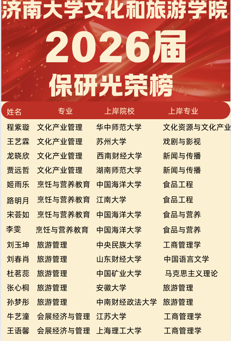 秋风送爽,捷报频传。永利3044官网多位学子凭借优异表现,成功获得硕士推免资格,即将开启新的学术征程。 这份保研荣誉榜,是学子们奋斗的见证,更是学院育人成果的生动彰显,为学弟学妹们树立了奋进榜样,也激励着更多文旅学子逐梦前行!